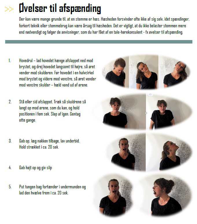 Hæshed kan skyldes eller forværres af, at du har spændinger i kæbe, hals, nakke og skuldre. Det er derfor en god ide at blive bevidst om, hvornår dine muskler er spændte og hvornår de er afslappet. Du kan prøve at spænde og give slip i næverne 3 gange i træk og mærke forskel på spændte og afslappede muskler.
